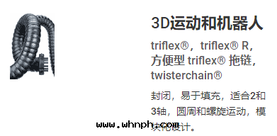 Triflex® R系(xì)統TRC.30系(xì)列 1. 可(kě)多(duō)維移動(dòng)——在(zài)複雜移動(dòng)中(zhōng)具有(yǒu)很高(gāo)靈活性(xìng),甚至是(shì)在(zài)第(dì)6軸。 縱軸上(shàng)每个(gè)鍊(liàn)节(jié)可(kě)旋轉(zhuǎn)約± 10°。 这(zhè)有(yǒu)助于(yú) 引導電(diàn)缆(lǎn)通(tòng)过(guò)有(yǒu)難度(dù)的(de)幾(jǐ)何結構 2. 通(tòng)过(guò)特别的(de)“拖車設計(jì)”(=球窩系(xì)統)吸收(shōu)大(dà)量(liàng)拉力, 從而(ér)可(kě)在(zài)所(suǒ)有(yǒu)軸上(shàng)平穩運轉(zhuǎn), 經(jīng)測試拉力可(kě)达(dá)2,340 N (TRC 100.145.0) 3. 卓越的(de)机械特性(xìng)——耐沖擊、防髒污、 結實(shí)、耐磨损、防碎屑。 借(jiè)助光(guāng)滑的(de)內(nèi)外(wài)輪廓,滑过(guò)障礙物(wù),並(bìng)保護電(diàn)缆(lǎn)。 在(zài)igus®實(shí)验(yàn)室(shì)中(zhōng)接受了(le)超过(guò)100万(wàn)次(cì)循环(huán)的(de)測試 4. 小彎曲(qū)半徑和(hé)小节(jié)距—— 實(shí)現(xiàn)节(jié)省(shěng)空(kōng)間(jiān)的(de)安裝(zhuāng) 5. 輕(qīng)松安裝(zhuāng)和(hé)拆除——一(yī)个(gè)壓鑄部(bù)件(jiàn), 因(yīn)此(cǐ)安裝(zhuāng)不(bù)费力。 牽引方(fāng)向(xiàng)不(bù)需要(yào) 支承元(yuán)件(jiàn)(如鋼(gāng)缆(lǎn)、彈簧件(jiàn)等) 6. 超級穩定——由(yóu)于(yú)止動(dòng)器位于(yú)外(wài)側, 精準止動(dòng)器用(yòng)于(yú)半徑和(hé)扭轉(zhuǎn)運動(dòng) 7. 由(yóu)于(yú)很容易将机器/机器人(rén)與(yǔ)智能(néng)附件(jiàn)相連(lián),所(suǒ)以(yǐ)配置时(shí)間(jiān)可(kě)降至最低(dī)